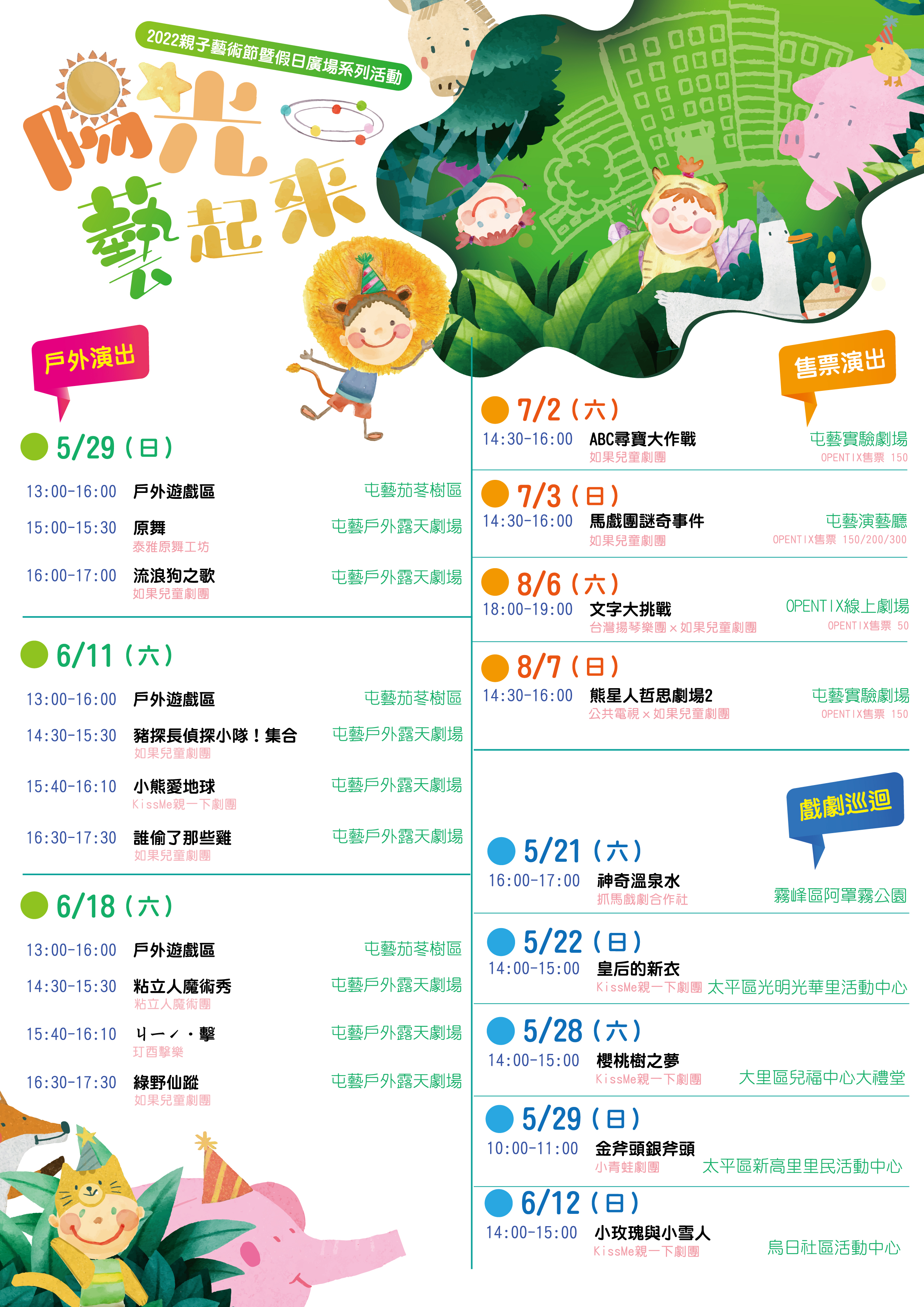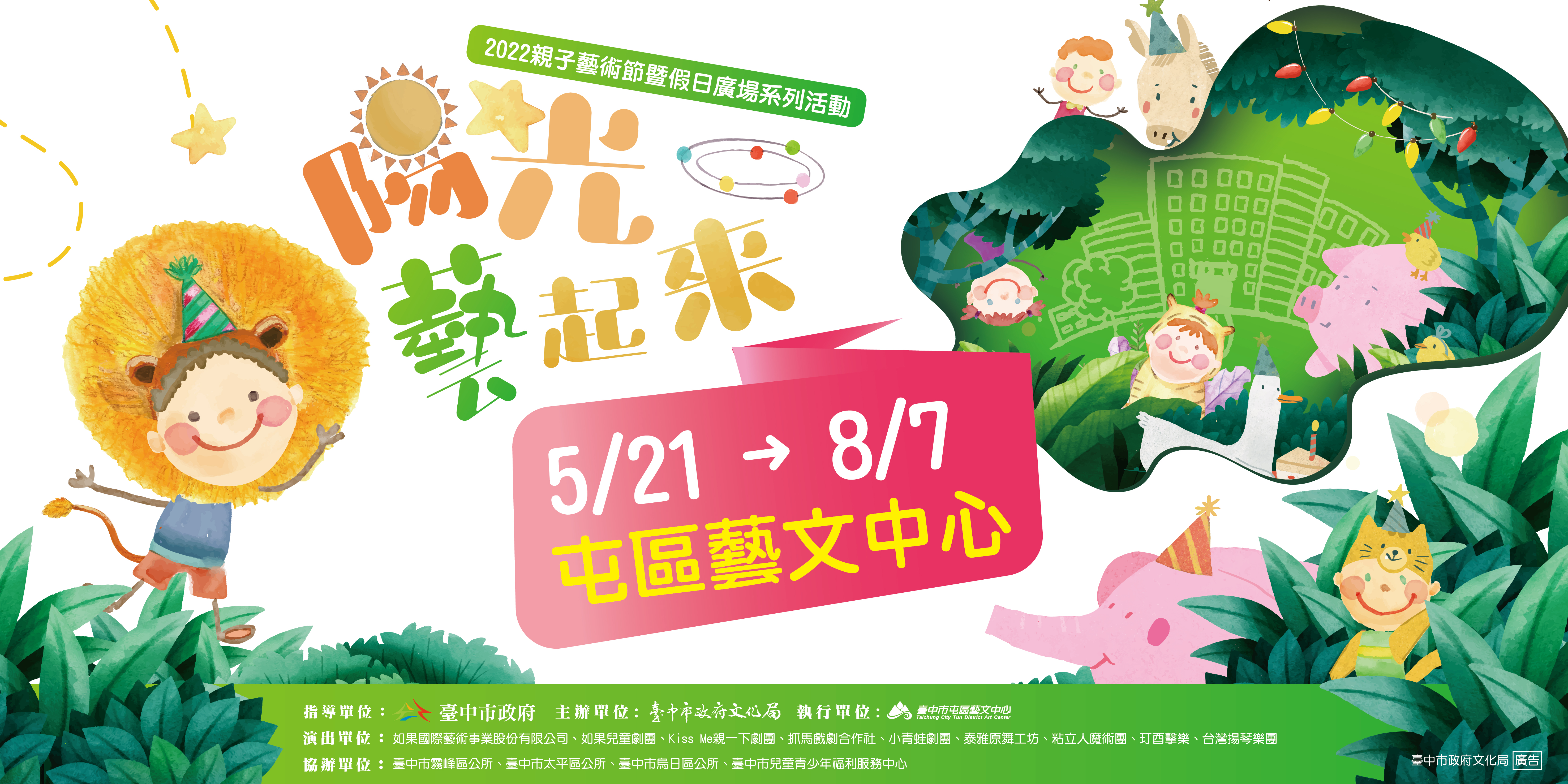 「2022親子藝術節暨假日廣場系列活動」今年上半年就要熱鬧登場囉!今年以「陽光藝起來」為主題,再次結合戶外場地推出一系列精彩的親子節目,多場免費親子活動適合周末全家出遊觀賞,爸爸媽媽趕快帶小朋友來看表演!活動詳情及售票資訊請鎖定中心官網、FB,活動如因疫情等因素異動,請以官網公告為主。參與活動的民眾請全程戴口罩、配合量體溫、噴酒精,活動現場需維持社交距離等防疫規定,請大小朋友務必遵守,健康第一,也玩得開心!